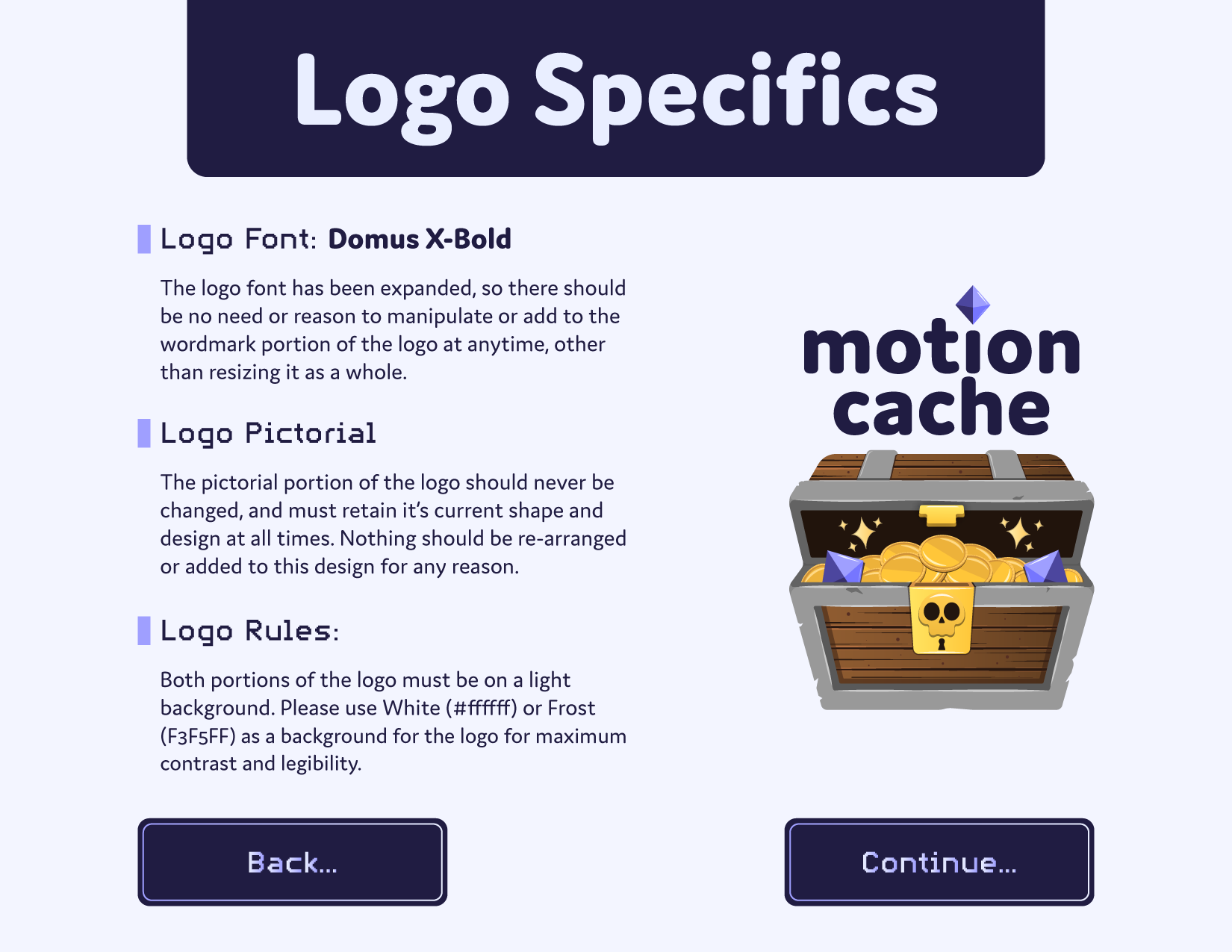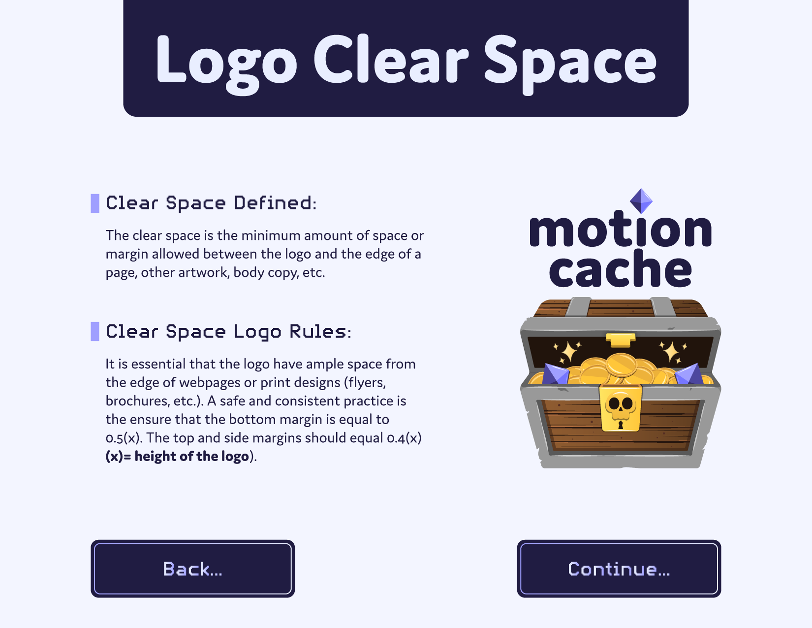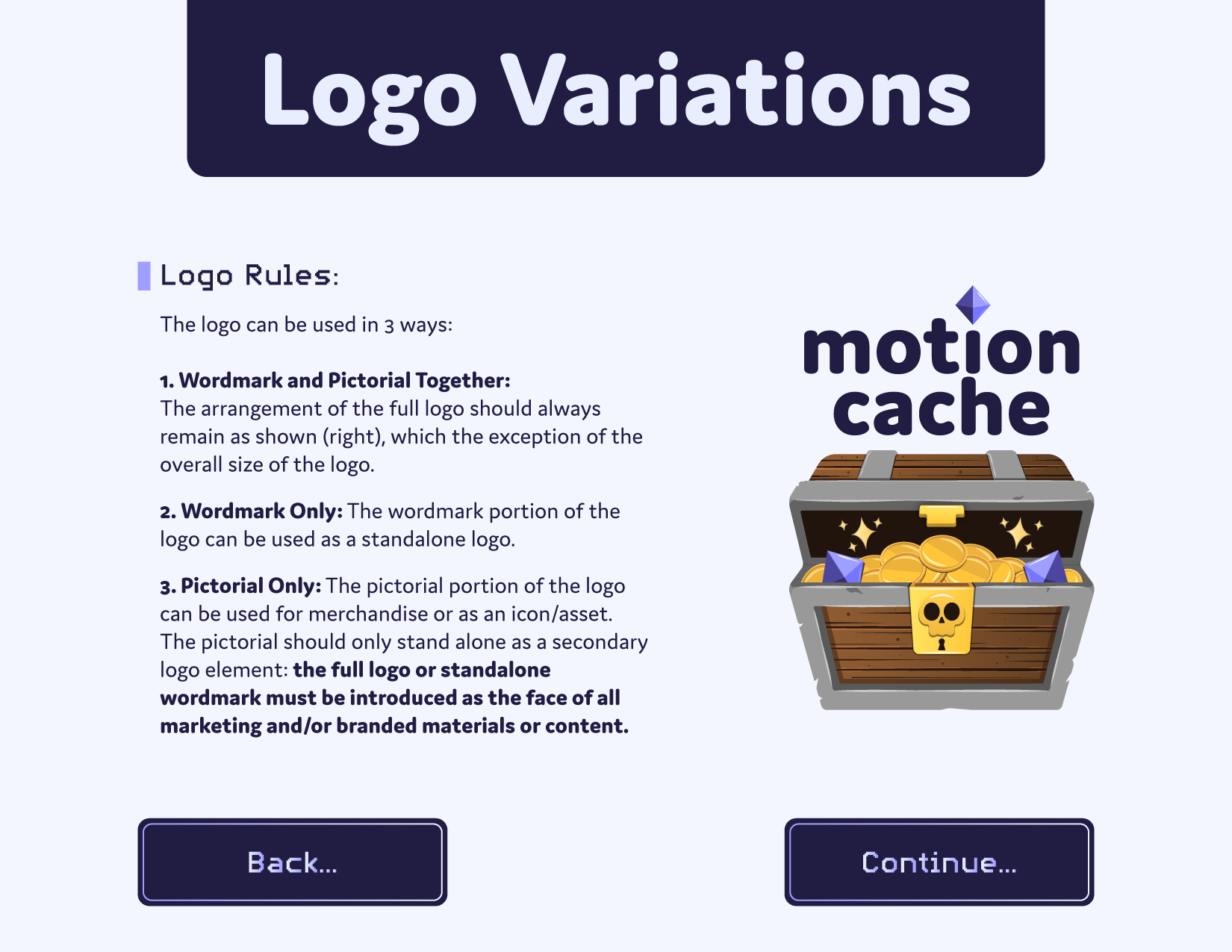 The logo features a treasure chest to symbolize a “cache” of content. It’s playful, discoverable, and tied to Motioncache’s audience of motion designers and gamers. Inspiration came from retro gaming brands like GameCube and titles like The Legend of Zelda, blending nostalgia with a modern feel. The combination mark allows the wordmark and pictorial icon to work independently or together, giving the brand flexibility across touchpoints.